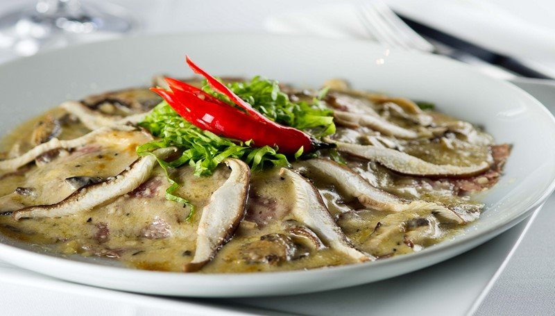 Carpaccio de Bacalhau, pistache, com um toque de ovo de codorna e batata palha. Também são de dar água na boca o Carpaccio de carne gratinado com shitake, funghi e azeite trufado.