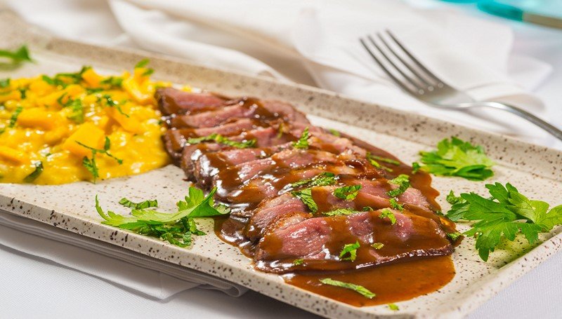 Entre carnes e peixes o chef preparou Atum em crosta de gergelim, purê de batata e gengibre; Magret de Pato com risoto de manga; Filet de Linguado em cama de palmito pupunha e tomatinhos cereja; Posta de Namorado grelhado com molho de alcachofras e camarão, com purê de mandioquinha; Tagliata de filé mignon de Leitão com ervas frescas crocantes e batata gratinada; Tornedor de filet ao molho de funghi Porcini, com risoto de brócolis.