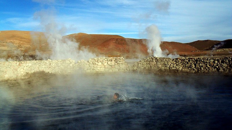 Algumas horas depois, já com a paisagem sem tanta fumaça dos gêiseres, a temperatura começa a subir encorajando alguns aventureiros a mergulhar na piscina termal do campo de gêiseres com temperatura da água variando entre 32°C e 36°C.